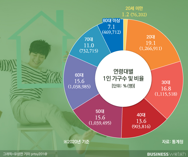 연령대별로 보면 20대가 126만6911가구로 전체 1인 가구 수의 19.1%를 차지해 가장 비율이 높습니다.