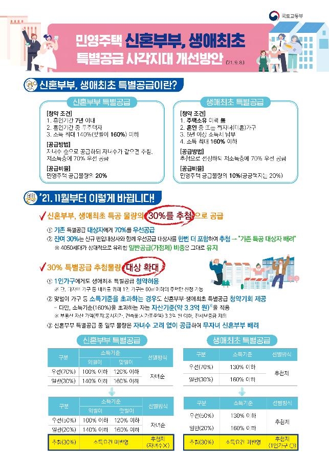 이 부분을 개선하기 위해 신혼부부 및 생애최초 특별공급 물량의 30%는 추첨제를 도입하기로 결정하였습니다.