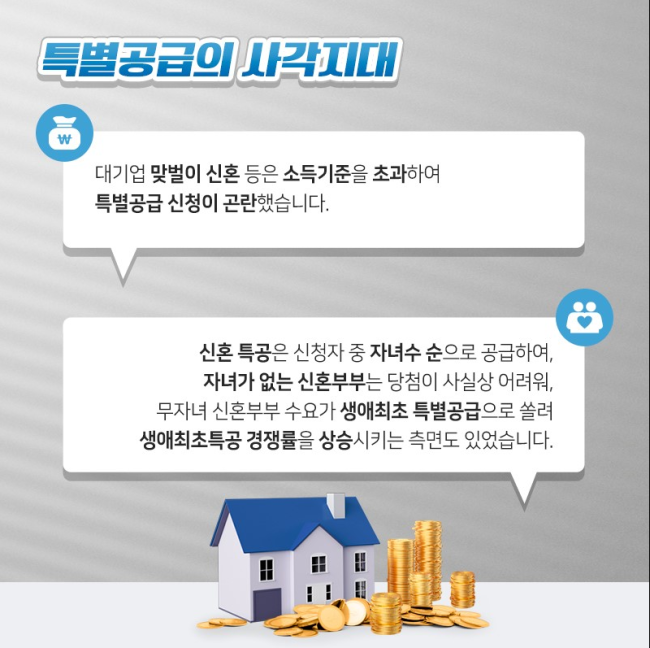 또한 맞벌이 신혼부부 중 소득기준을 초과하여 특별공급 신청이 어려운 경우가 많았습니다.