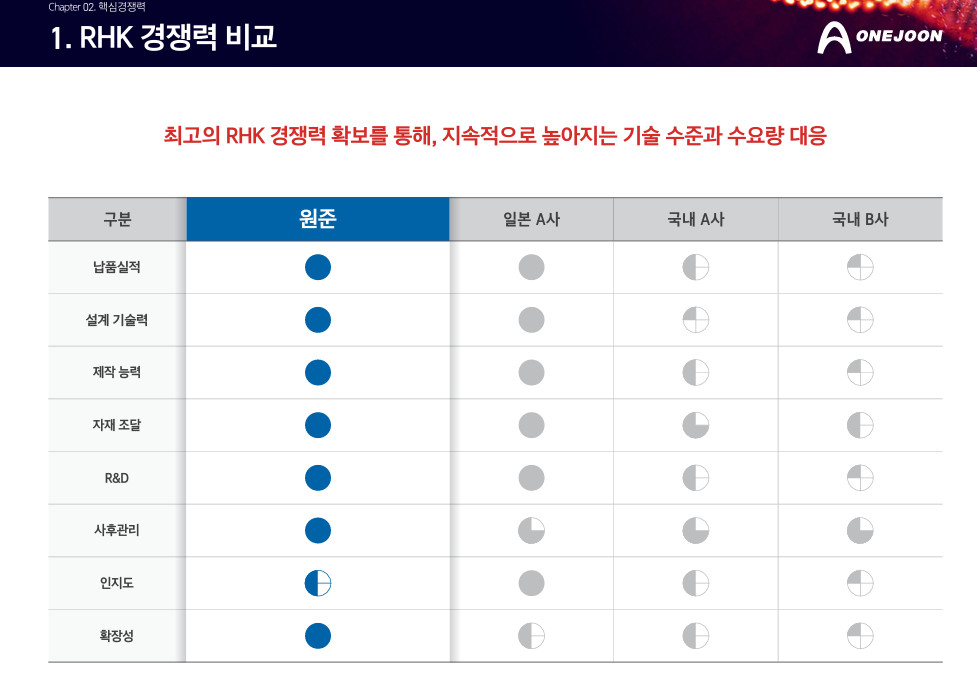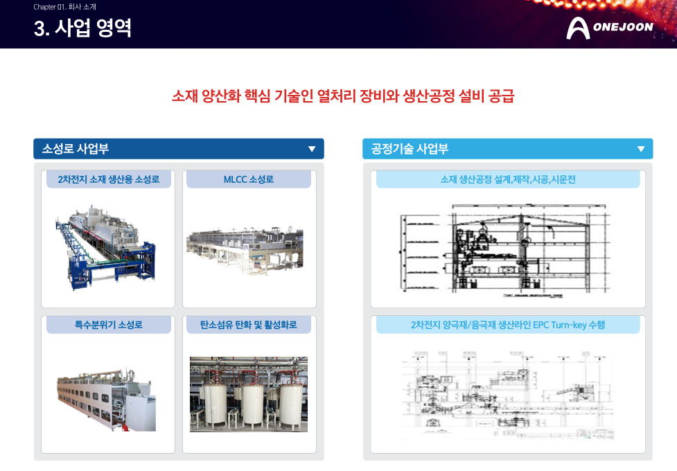 현재 원준은 각종 첨단소재 생산을 위해 필수적으로 필요한 열처리 소성로 장비를 제조 및 판매하는 사업과 소재의 생산 공정에 대한 솔루션을 제공하는 공정 설비 엔지니어링 사업을 영위하고 있습니다.