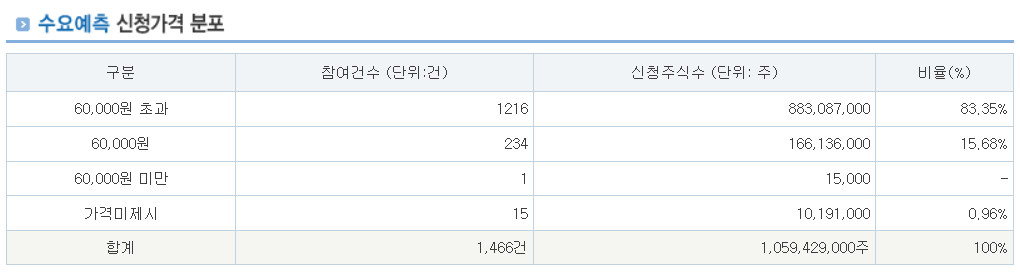 더욱 긍정적으로 보이는것은 99.04%의 기관투자자들이 공모가 최상단인 60,000원 이상으로 가격제시를 했다는것입니다.