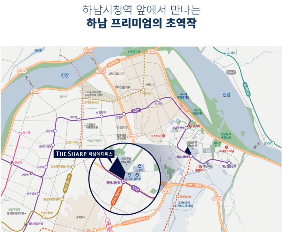 게다가 2028년 3호선 연장선(오금역-교산-하남시청역) 완공이 예정되어있는데요. 즉, 5호선과 3호선을 모두 이용할 수 있게 되는 더블 초역세권이 될 예정입니다. 또한 근처 미사강변도시에 9호선 연장선도 이용이 가능하기 때문에 이 부분도 굉장히 긍정적으로 보입니다.