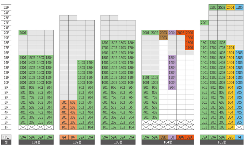 - 59A 타입 : 다자녀가구(4.7:1), 신혼부부(41.5:1), 생애최초(217.8:1), 노부모부양(24.2:1), 기관추천(3.3:1)