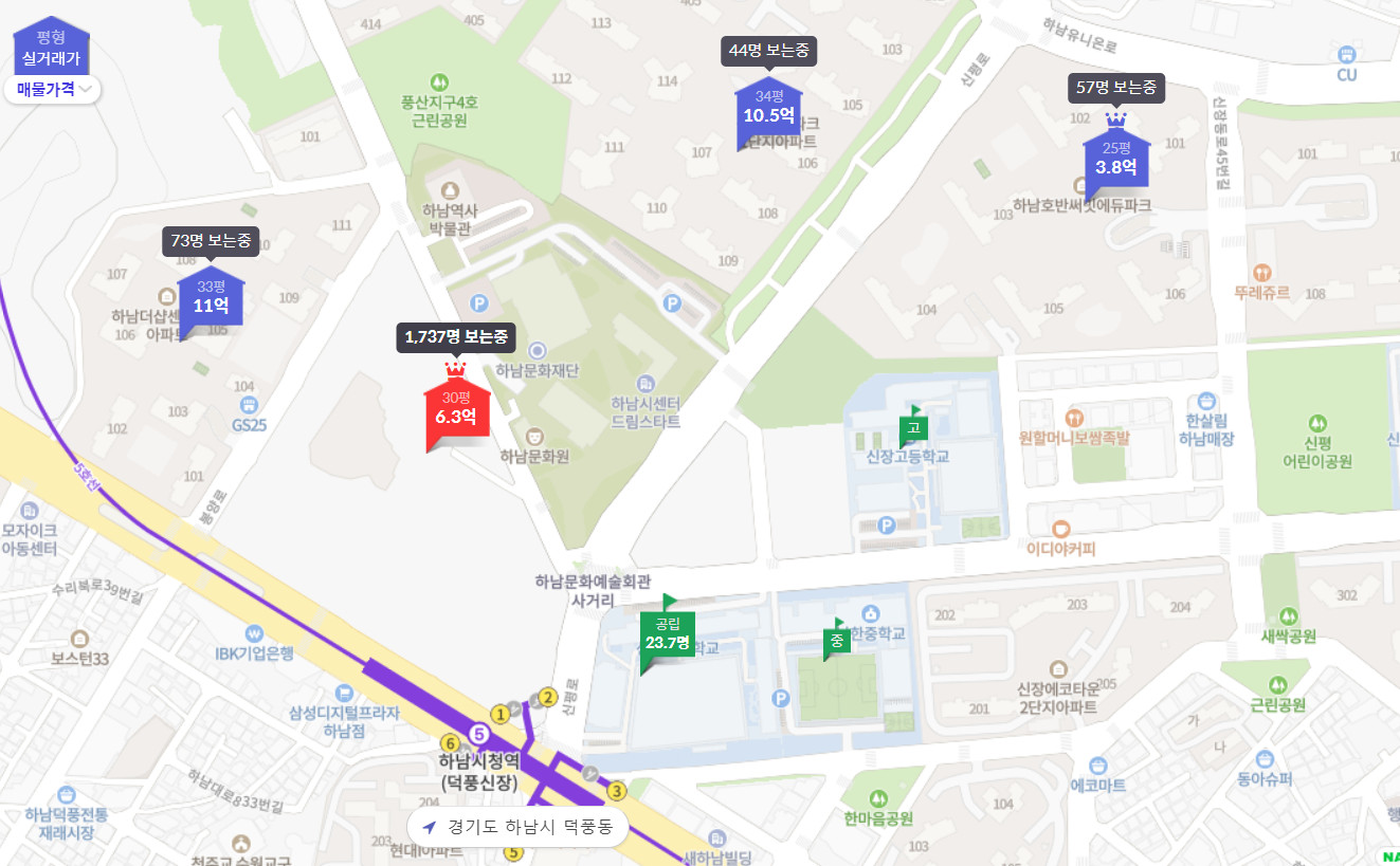 인근에 있는 하남풍산아이파크1단지 84㎡가 최근 10.2억에 거래되었으며, 하남더샵센트럴뷰 84㎡ 역시 실거래가가 10.7억입니다.