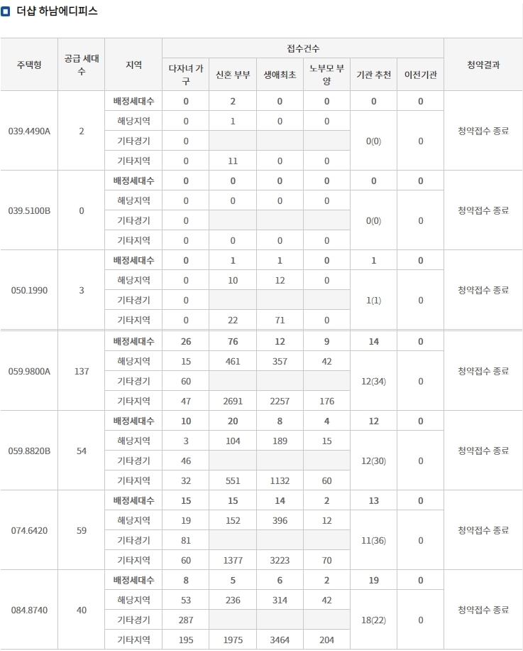 - 50타입 : 신혼부부(32:1), 생애최초(83:1), 기관추천(2:1) 외 모두 미달입니다.