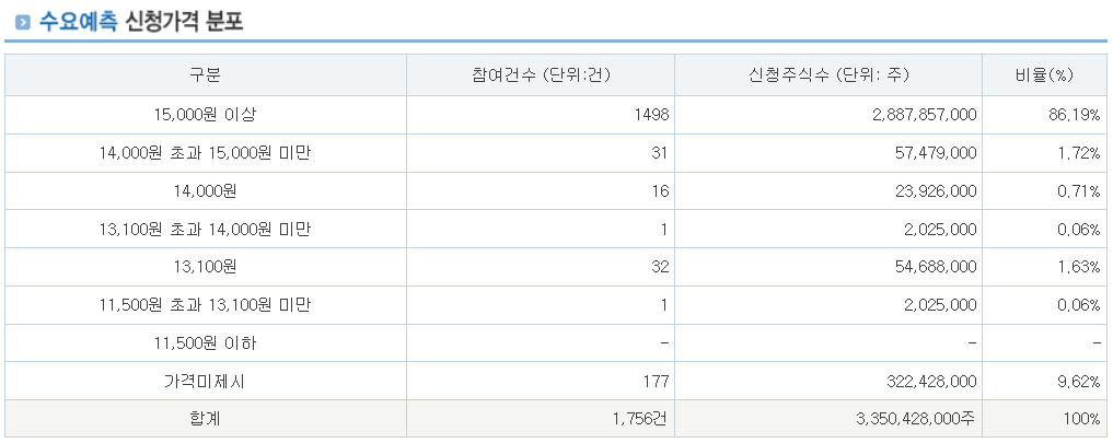 더욱 고무적인건 15,000원 이상을 제시한 기관투자자가 무려 86.19%라는것입니다.