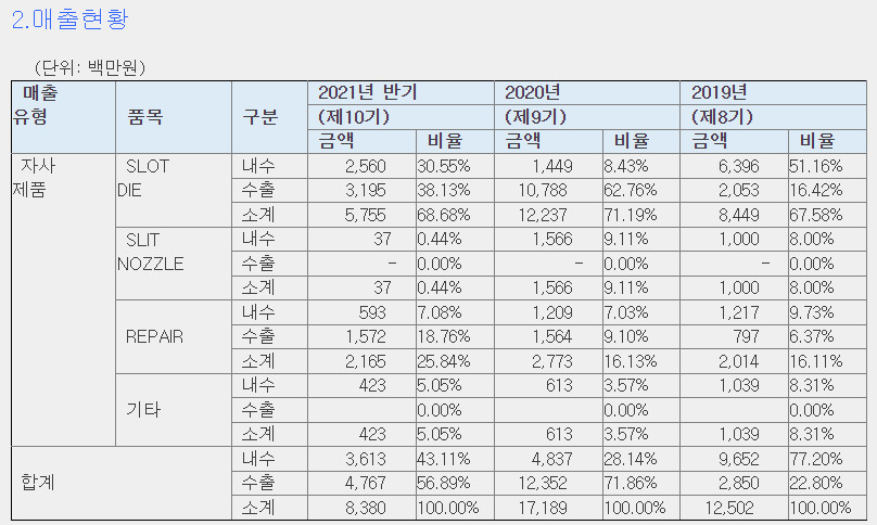 또한 디스플레이 생산공정에 사용되는 슬릿노즐 또한 주요 매출 품목인데요.