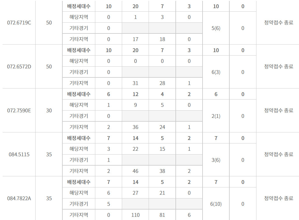 - 72C 타입 : 생애최초(3:1), 기관추천(1.1:1) 외에는 모두 미달입니다.