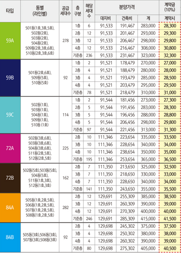 6) 납부 일정 : 계약시 계약금 10% 납부, 중도금 60%는 6번 분할하여 납부, 입주지정일에 잔금 30% 납부