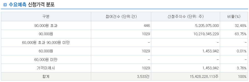 기관투자자의 99.99%가 공모가 상단인 90,000원 이상을 제시 했습니다.(미제시 포함)