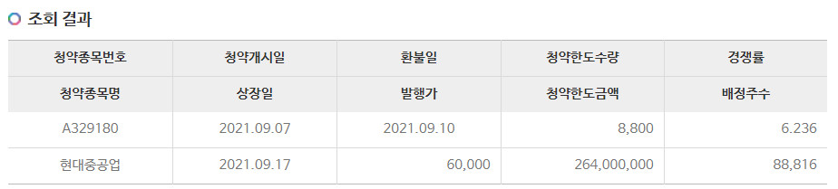 3) 현대중공업 공모주 청약 배정 결과 발표 : 9/10(금)