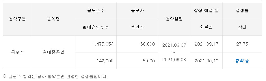 1) 현대중공업 공모주 청약일 : 9/7(화)~9/8(수) 10:00 ~ 16:00