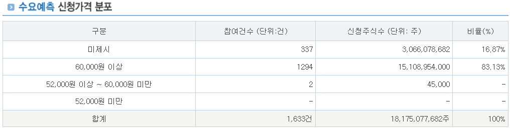 기관투자자의 99.88%가 공모가 상단인 60,000원 이상을 제시 했습니다.
